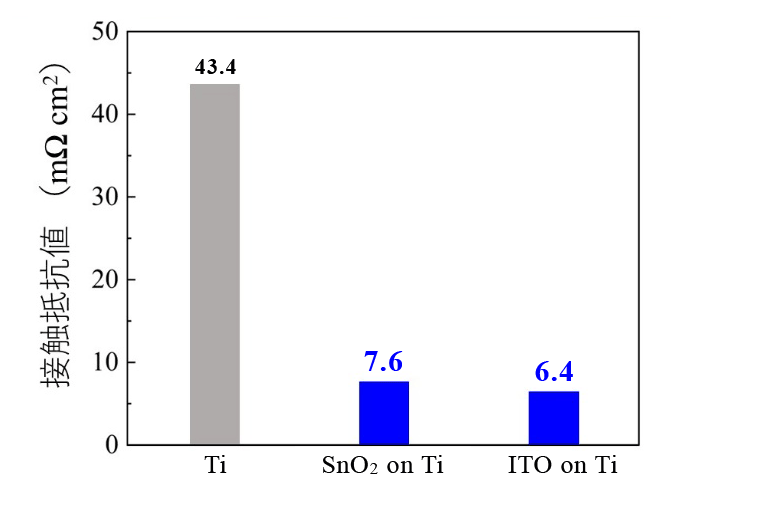 実験結果として、Ti基板上に成膜した低抵抗SnO₂とITO(Snを添加したIn₂O₃)※4は図3に示すように7.6mΩcm²、6.4mΩcm²をそれぞれ達成いたしました。