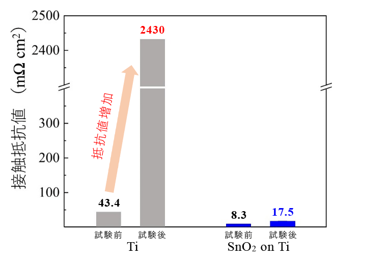 また、図4に示すように、水電解の動作環境を模した硫酸水溶中に72時間2.0V(vs. RHE)定電位分極した後のTi基板、Ti基板上に作製したSnO₂(SnO₂ on Ti)に対し、試験前後における接触抵抗値を測定したところ、SnO₂ on Tiでは、試験後の接触抵抗値が急激に上昇することがないことが確認されました。