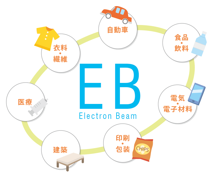EBは電子を加速器で高エネルギー化し、基材(フィルムなど)に照射する技術で、光や熱とは異なるエネルギーによって物質に化学的・物理的変化を与えることが可能です。
