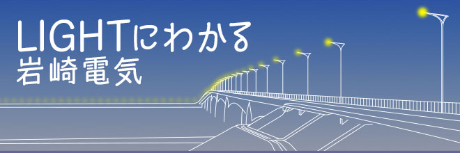 岩崎電気のご紹介 光(LIGHT)の会社、岩崎電気を簡単(LIGHT)にご紹介します。LIGHTにわかる岩崎電気 岩崎電気のあゆみ岩崎電気の誕生からこれからをダイジェストでご紹介。 岩崎電気の強み光にこだわる岩崎電気の光技術は、照明や光環境へと次々と拡がっています。 岩崎電気の事業:都市環境-照明部門都市景観照明、スポーツ・リゾート照明、オフィス・商業施設照明をご紹介。 岩崎電気の事業:環境保全-光・環境部門紫外線殺菌、水処理システム、EB(電子線)開発をご紹介。 岩崎電気の事業:情報化社会-光・環境部門印刷・製版システム、光学機器用光源、情報表示システムをご紹介。 豊富な納入施設/こんなところに岩崎電気身近なあかりや、普段目にすることのない研究施設まで、岩崎電気の光が、さまざまな場所で活躍しています。
