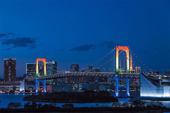 東京港の夜景を彩るレインボーブリッジのライトアップ -