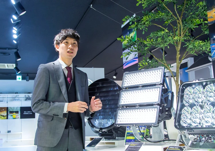 新卒で精算機メーカーに就職しました。ホテルのフロントに設置し、チェックイン・アウト時に使用する精算機の営業をしていました。合わせてホテルコンサルもやっていて、内装を提案するときに照明には関わっていました。新規事業拡大で誘われた2社目を経て再度転職を考えた時、ウェブで調べて岩崎電気を知りました。それまで知っていた照明とは違うその汎用性の高さから、照明の可能性に惹かれて入社を決めました。