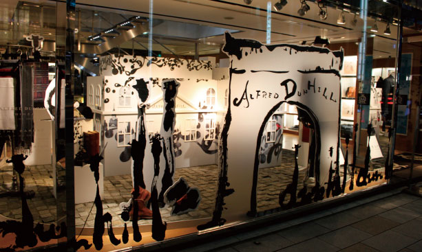 ダンヒルのウィンドウディスプレイはとても楽しくさせていただいた仕事でした。普通の書の展示をご依頼いただいたのですが、私なりの世界観でダンヒル氏のイメージを膨らませ、「犬と紳士と私」という作品をつくりました。どんな作品も出来るまでは大変ですが、色々な可能性を想像して考えている時が一番楽しい時間です。