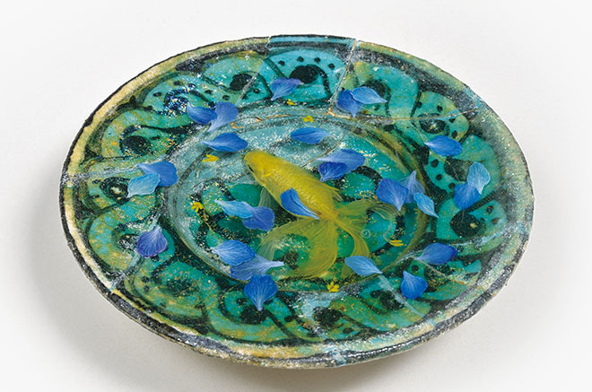 2000年に金魚をテーマにした作品づくりを始めて試行錯誤の末、器の中に高透明の樹脂を流し込み、表面にアクリル絵具で金魚を部分的に描き、さらにその上に樹脂を重ねて描く作業を続けることで立体的な金魚を表現するという技法に辿り着きました。私にとって金魚は単なるモチーフではなく、言語であり、私自身の内面の感情を表現する手法でもあるのです。金魚を通して人間の本質を描きたいという思いで作品づくりを続けていますので、樹脂を使ったこの技法を編み出してから、もう18年ほどが経ちましたが、金魚がこれからも私の創作テーマであることに変わりはありません。