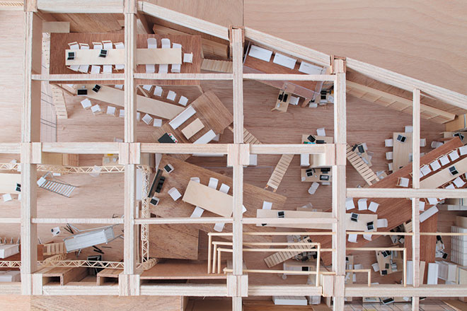 「ライゾマティクス」のオフィスでは、高天井のワンルームという特性を生かして、竣工した時が完成ではなく、使う人々が自由に活動を積み重ねていくことができる状況を目指しました。既存のラーメン構造(柱と梁が剛接合している構造)鉄骨鉄筋コンクリート造の躯体を利用しつつ、「ビッグテーブル」という中2階を作り、ひとつの場所をプログラムによって区切るというよりも、実際の使い方によってすべての場所が自然と混ざり合い、重なり合っていくようなオフィスのあり方を提案し、大きな模型をのぞきこみながら設計を進めました。竣工後は私たちが設置した木造の「ビッグテーブル」に、その場で働く人たちによって棚が造作されていたりして訪れる度に発見があって、設計者としてとても嬉しいです。このプロジェクトは、ある意味で街づくりにおけるマスタープランのつくり方にも通じる部分があります。最初からきっちりと決めてしまうのではなく、ある程度バラバラにしておくことで、後で足されるものも自然に混ざっていくのではないかということを教えてもらったような気がします。それは例えるなら庭のような状況です。どこかで花が咲いた時に、そこは花が咲く場所ではないと言って雑草のように抜いてしまうのではなく、その花に愛着を持って育てていけるような土壌を作りたいという思いがあります。何か思いがけないことが起こった時に、アクシデントとして捉えずに、ストーリーのきっかけになるような、そんな建築を作りたいのだと、ライゾマティクスのプロジェクトを経て、いま感じています。