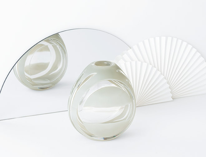 堀口切子の強みは、伝統と真摯に向き合いながら、常に新しいモノづくりに挑戦し続けていることだと考えています。弊社では、企業とのコラボレーションでペットボトルのデザイン監修や照明器具のデザインなども行っており、江戸切子という伝統工芸の可能性を広げる試みに取り組んでいます。良いものは残し、必要なものは加え、不必要なものは勇気を持って省いていく“残す・加える・省く”という堀口切子の理念を念頭に、私自身も新しい作品づくりに力を注いでいます。毎年開催される「江戸切子新作展」への出品もその一つで、2021年度は、“余白”をパターンとして表現した作品を出展させていただきました。自分の考えを自由に作品に表現できる機会であり、私にとっては非常に貴重な場となっています。