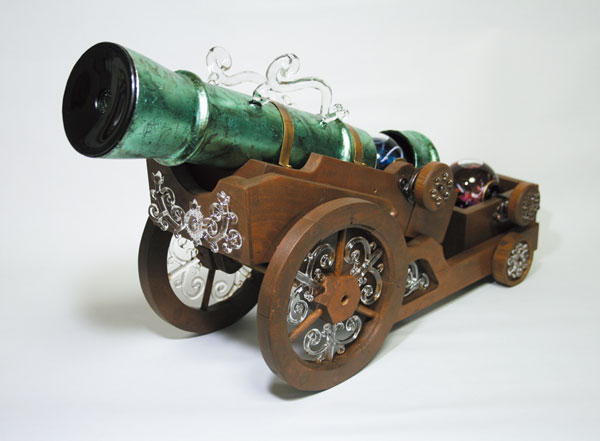 私はパーツには多彩な色彩のボロシリケイトガラスを使用し、滑らかな動きが出せるオイル万華鏡も多く制作しており、筒状の万華鏡自体とボディに酸素バーナーワークで装飾を施して一つの作品に仕上げています。幸運なことに、デビュー作となった作品は、Bunkamura 30周年記念 万華鏡2019 第一回全国公募展で最優秀賞をいただき、翌年度の万華鏡展2020では、ポスターのメインビジュアルとして、木とガラスを使い大砲をモチーフにした作品を採用していただく機会に恵まれました。