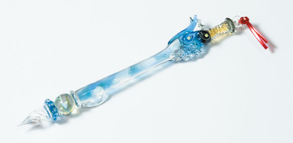ガラスペンは、ペン先の側面に細かい溝を入れ、そのペン先をインクに浸して筆記をするつけペンの一種です。ガラス特有の透明感と繊細な美しさに加え、使い方や手入れも簡単なので、近年特に文具好きの方々の間で人気を集めています。筆記具としての実用性とデザインを両立させることは、ある意味大変ではありますが面白さもあり、ハンドメイドならではの温もりを感じていただける作品をつくっています。今春は(株)PARCOさまからご依頼をいただき、PARCO × FINAL FANTASY※ コラボ企画による30本限定のガラスペンを制作いたしました。『FINAL FANTASY X※』の主人公ティーダの武器「フラタニティ」をモチーフにしたガラスペンは販売開始後30分ほどで完売したとお聞きし、とてもありがたく思っています。