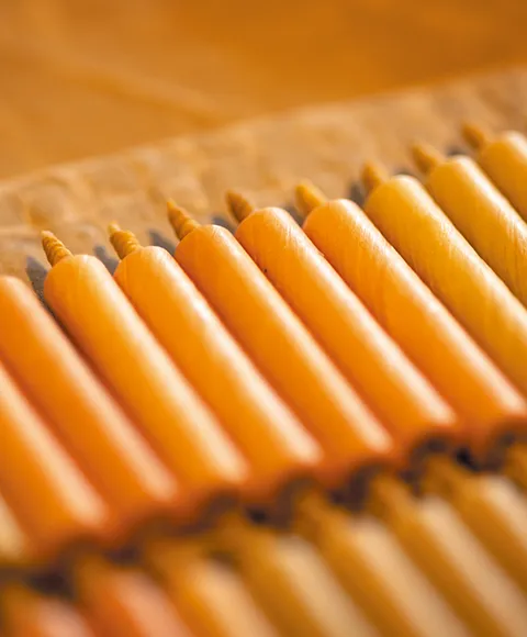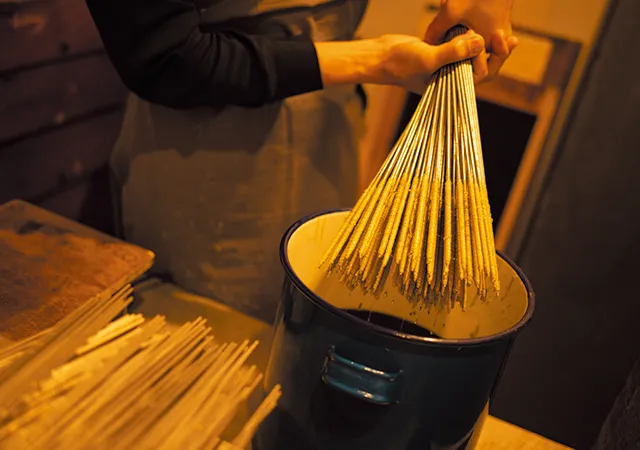 和蝋燭は、櫨蝋屋、灯芯屋、蝋燭屋の3つの分業制で成り立っています。私は、日本の伝統工芸の分業というあり方を尊重しながら、現代の和蝋燭と新たな価値の創造を目指し、日本古来の技法である手掛け製法を用いて、櫨蝋を1本1本手で塗り重ね、手間ひまをかけて和蝋燭づくりを行っています。温度や湿度によって差があるため、ひとりで製造できる数は夏場なら1日150本、冬場は300本程です。