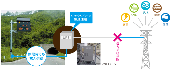 一例として道路情報表示板に接続すれば、災害で電力系統が遮断されたときでも、必要な情報を表示し続け、道路利用者の避難や安全確保につながります。
