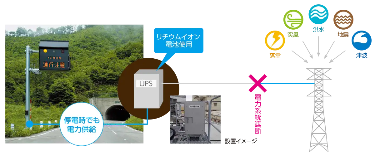 一例として道路情報表示板に接続すれば、災害で電力系統が遮断されたときでも、必要な情報を表示し続け、道路利用者の避難や安全確保につながります。