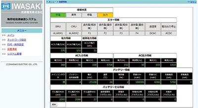 パワーユニット部に実装されている液晶画面により、電池残量、電源電圧、内部温度などをリアルタイムに確認することが可能です。また、ウェブサーバを内蔵しているので、IP監視接続機能時ではネットワーク先から遠隔監視が可能です。