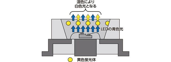 もう1つは、青色LEDと光が当たると黄色に発光する蛍光体により白に見えるもの。