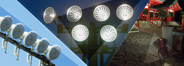 - 屋内外のサインボードから大壁面まで、幅広い場所で活躍する、多彩なバリエーションの看板用照明器具。