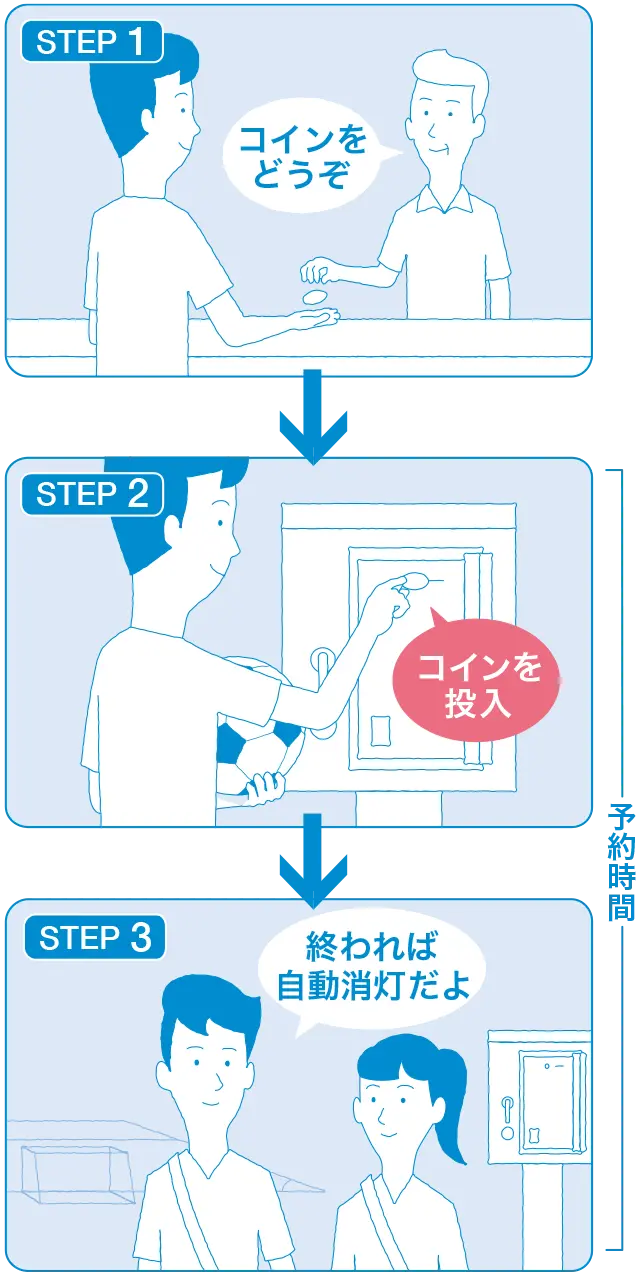 専用コインによって照明設備が点灯するシステム。使用目的に合わせて部分点灯と全点灯の切換えもでき、中小規模体育施設におすすめします。