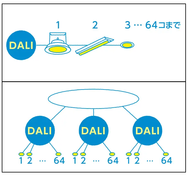 1つのシステムに64のDALIアドレスが設定できます。(照明器具、スイッチの合計)