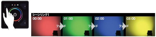 制御盤内のカラースイッチから、4種類のシーン(時間軸のあるカラー演出)の呼出ができます。