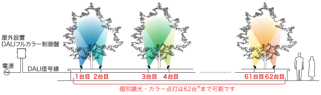 - 制御盤にDALIルータを内蔵し、器具ごとのON/OFF、カラー調節や調光、スケジュール設定が可能となりました。これにより、DMX制御のような多彩なカラーチェンジや、季節や時間帯に合わせたカラー演出が可能です。