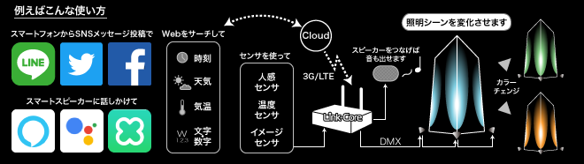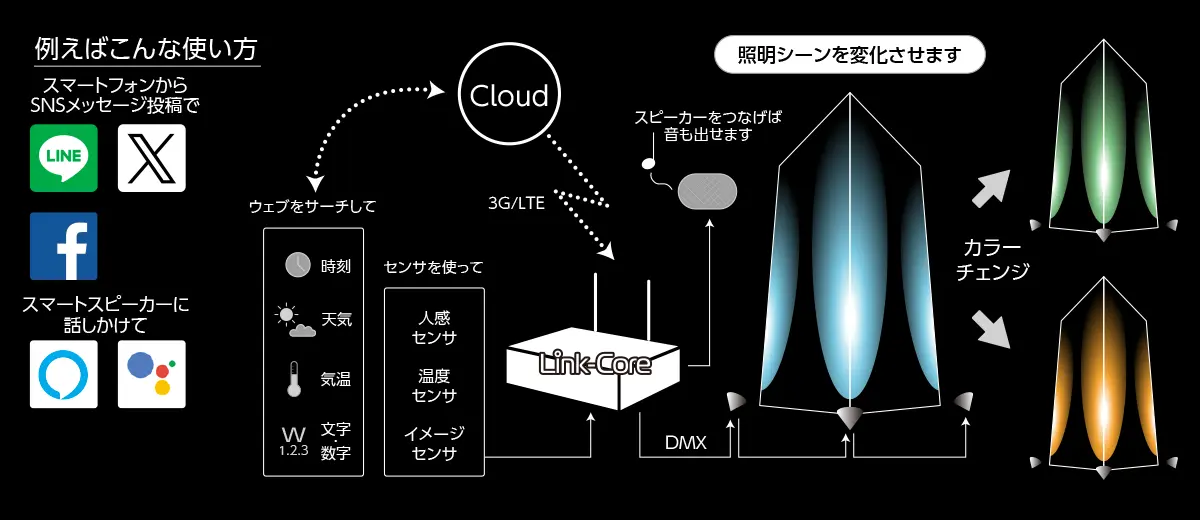 Link-CoreはIoT(Internet of Things)制御装置です。PCやスマートフォンなどのIoTデバイスから操作し、インターネットを経由して照明を制御。さまざまな情報をトリガーとして、照明演出を行うことができます。