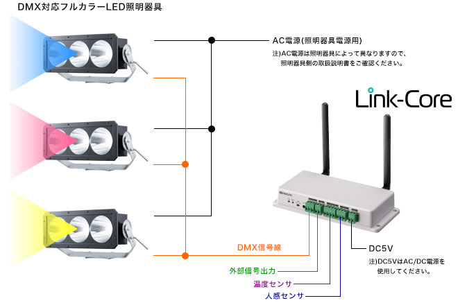 - ※Link-Coreに接続するセンサ(人感センサ、温度センサ)はオプションとなります。