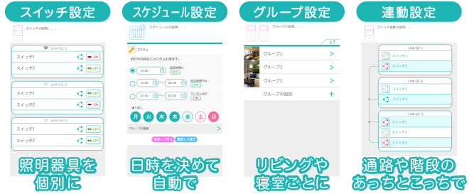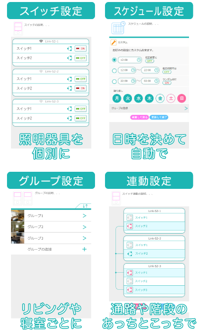お手持ちのスマートフォンにLink-S²専用のアプリをインストールすることで、さまざまな設定による照明のON/OFFができます。