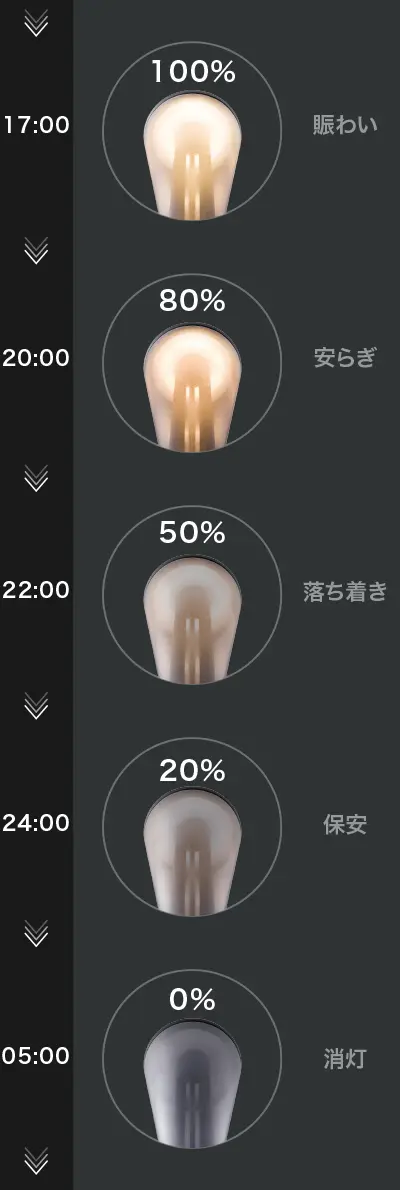 人の多い時間の賑わいをうむ光から深夜の保安灯まで必要な光を自動で変化させます。
