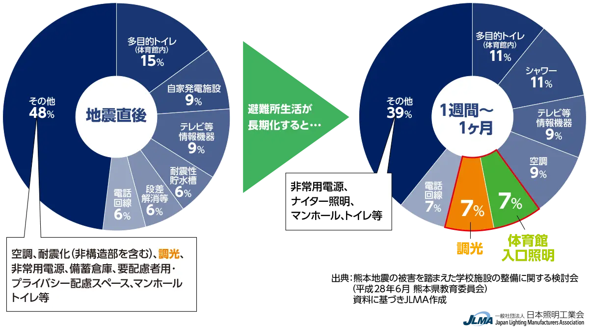 地震直後あかりに対する要望は、「その他」の項目でしたが、避難所生活が1週間以上経過すると「体育館入口照明」「調光」の項目の数値が上がり、あかりの重要性は優先順位が高くなることが読みとれます。