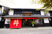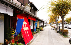 彦根城旧中濠に架かる「京橋」から南西へ伸びる約350mの通りが平成の城下町・夢京橋キャッスルロード。両脇に並ぶ約50軒の町屋を模した店舗は、白壁と紅殻に煤がけの黒格子、いぶし瓦の切妻屋根の傾斜を揃えて、江戸時代の町並みを再現した城下町情緒あふれる通りだよ!車道は土色に舗装、歩道はさび入り御影石を素材にして石畳の雰囲気を漂わせ、各所に石のレリーフも設置。街の景観を保つため電線類はすべて地中化され、街灯も行灯風で並木はケヤキで統一されているの。