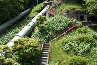「水と森のテラス」からは、三居沢発電所と、その背景に広がる豊かな自然を一望できたよ。明治33年(1900)当時に水を流していた、ずい道(トンネル)の出口や、山の上から一気に水を落とす長さ45mの水圧鉄管を眺めていると、風雪に耐えてきた長い歳月の重みを実感したよ。ちなみに発電所で作られる電力量は、300世帯程度をカバーしているそうだよ。水力発電といっても、明治の開業当初とは違って莫大なエネルギーの安定供給を必要とする現代社会では、なかなか大変な面もあるんだろうなぁとアイは感じました。