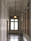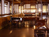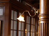 太い木の円柱についているブラケットライトや柱頭の木彫装飾、重厚な格天井を眺めているとまさに「華麗なる海運業」といった感じがしたよ。窓ガラスは全て二重ガラスになっていて、百年以上経っても狂いがなく、いまでも窓の開閉が出来るそうで、雨水が入らないように、窓が破損しないように、細部にわたって工夫がなされているの。ロールカーテンも百年前の物だそうだよ。