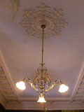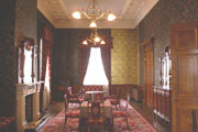 2階は貴賓室と会議室。貴賓室は、寄せ木造りの床、空色漆喰の天井、菊模様金唐革紙の壁、鏡付の大理石暖炉、シャンデリア、絨毯、蒸気暖房など、当時の材質・デザインが細部に至るまで再現されていて、文明開化の華やかかりし時代にタイムスリップしたような懐かしさがこみあげてくる不思議な気持ちに!