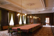 1906(明治39)年11月に2階会議室で日露戦争後、樺太の日露国境画定会議が開かれ、向かって左側がロシア、右側が日本だったそうです。日本の繁栄ぶりをロシアに示す狙いもあったらしく、貴賓室と共に出来る限りの贅を尽くされた華麗な空間。アイが案内していただいた方のお話では、終戦後、建物がGHQに一時期接収されて、その期間に、金唐革紙の壁などに煙草のこげ跡や汚れを付けられたとのことで、凄く残念な気持ちになりました。