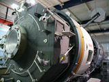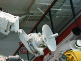 科学センター2階ホールから、順路に従ってミール展示館へ進むと、2階から見下ろす形でフロアいっぱいに宇宙ステーション「ミール」本体と天体観測モジュール「クバント」がドッキングしている状態で目に飛び込んできたよ!予想していたよりはるかに大きくてしばし呆然!説明パネルによると、「ミール」は1986年2月19日に旧ソ連が打ち上げた世界初の長期滞在型の宇宙ステーションで「ミール」本体に6個のドッキング・ポートを持つことで、無重力環境での実験や宇宙観測などで大きな成功を収めたの。