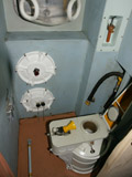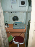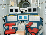 宇宙飛行士は基本的に1日8時間の作業を行い、休日は週に2日で、地上にいる家族と週に1回は交信できることになっていたんだって!宇宙でも規則正しい生活が必要なんだね。プライベートルームは、寝袋で立ったまま眠る半畳程度のスペースで、寝袋は睡眠中からだが浮かないように壁に固定してあるの。旧式の音楽プレーヤーが置かれていたけどロシア人飛行士はいったいどんな音楽を聴いていたのかなぁ?トイレは無重力対応の吸引式、水が流れないから空気で吸い取るんだよ。操縦室にあるトレーニングマシーンは無重力による筋力の衰えを防ぐための必須設備で、毎日2時間のトレーニングが義務づけられていたそうだよ。運動音痴のアイにはやっぱり宇宙飛行士は無理かも・・・。(涙)船内の照明器具はすべてユニット交換式なの。ランプ交換の際、万一、ランプが割れたら船内中に破片が漂うことになるからね。