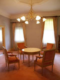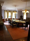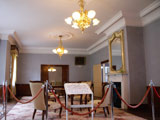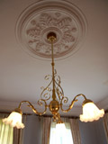 建物の内部は部屋ごとにルネッサンス様式の意匠を凝らした優雅な造りになっていて、アイもすっかりタイムスリップした気分に・・。各部屋のマントルピース、天井に施された漆喰で彫刻した円形のメダイヨンやシャンデリア、大理石や蒔絵を惜しげもなく用いた家具調度品などはロココ調、アール・ヌーヴォーあるいはジャコビアン様式などのデザインが施された豪華なもので、アンティ−クな家具やロココ調のシャンデリアは全てが手作りだそうです。