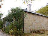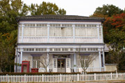 旧中石家住宅旧下水家住宅は、冬の間は雪で閉ざされた徳島県美馬郡一字村、剣山麓の北斜面、標高1000mのところにあった山村農家を移築したもの。安永10年(1781)の建物で、上屋梁、下屋梁に穴をあけ一本の柱を通すという「おとしこみ方式」で組まれているんだよ。黒光りする太い梁を組んだ空間構成は力強く魅力的でした。旧中石家住宅は、平家の落人村として有名な祖谷(いや)の民家で、いずれも萱葺の葺き降ろしの主屋、隠居屋、納屋が一列に並んで建っているのが祖谷の民家の特徴だそうです。隠居屋が、出入りが楽にできるように床を低く作ってあったのが印象的でした。バリアフリーの先駆けだね!最後に、出口手前にある白い洋館が異人館。明治38年(1905)イギリス人ウィリアム・ダウン氏の住宅として神戸市に建てられ、日本人の奥様の名前によりワサ・ダウン住宅と呼ばれていたそうです。昭和51年(1976)に四国村に移築されたんだって。1階がカフェで2階が事務所として使われていました。建物の表にあるポストとガス燈はロンドン西南部のチェルシーにあったものだそうです。四国村の中で唯一ここだけは異国情緒を感じさせてくれるよ。