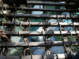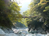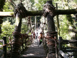 民謡「祖谷の粉ひき節」にも歌われる、かずら橋は、平家の落人が源氏から逃れるために、いつでも切り離せるようにと、山間に自生するシラクチカズラのつるを編んで作った橋といわれているの。橋の長さは45m、水面からの高さは約14m、幅は1.5mでちなみに橋を渡る料金は500円で一方通行だよ。安全のためにワイヤ・ロープで補強されているけど、深い谷間に架かっているから、一歩踏み出すごとにゆらゆら揺れてスリルと風情を楽しむことができるよ!3年に一度、安全のため架け替えられているそうだよ。山梨県の「猿橋」、山口県の「錦帯橋」とともに、日本三奇橋のひとつに数えられていて、国の重要有形民俗文化財に指定されているの。