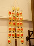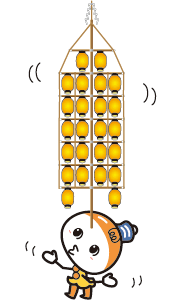 竿燈という言葉が使われるようになったのは明治14年(1881)になってからだそう。初期の竿燈は親竹と横竹によって組み立てられたものに、提灯をつるして持ち歩き、力自慢を競い合ったの。その後、額や肩、腰などにのせて妙技を競うようになり、またこれをもっと高くするために継ぎ竹が考案され、さらに花傘や勇み人形、纏(まとい)などが飾り付けられて、現在のような竿燈に近くなったそうだよ。