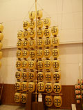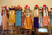 館内は竿燈のほかにも、展示ホールでは土崎港曳山まつりの置山車や太平山三吉神社のぼんでん祭りのぼんでんを展示。竿燈まつりが秋田の夏を彩る行事なら、ぼんでん祭りは 1月17日に行なれる厳寒の冬の秋田を熱くする勇壮な行事。ぼんでんは大きな御幣(ごへい)で神様の依代(よりしろ)や奉納物の役目をするの。長さ3mほどの竹に円筒状の竹かごを取付け、それに色鮮やかな布や紙を貼り、頭部に太い布鉢巻きを巻いて当日の朝に数十組のはんてん姿の青年たちが各々のぼんでんを奉じて神社を目指すそうだよ。