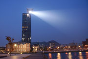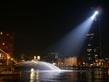 毎夜日没と同時に始まるライトアップは、レトロな夜をより幻想的にしてくれます。日本を代表する建築家 故黒川紀章氏が設計した高さ100mを超える高層マンション「レトロハイマート」屋上に設置された2台のスポットライトから放たれるダイナミックな光、1台は浮桟橋に設けられた噴水を照らし、もう1台はゆっくりと回旋しながら水面に光跡を描きます。地上では、水際に設置したレインボーライトのきらめきが、水面に幻想的に映りこみ、リズミカルで楽しげな光景を創り出しています。