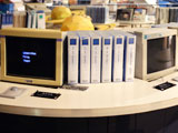 展示室の中央付近から出口までは、「ボイジャー惑星探査船」、「アポロ月面着陸船」、「バイキング火星着陸船」の精巧なレプリカと「ルナ24号月面着陸船」の実物のバックアップ機が中心の展示となっています。「ボイジャー惑星探査船」は、人類が作ったものの中で地球から最も遠いところに存在しているの。木星、土星の探査を目的に惑星探査機ボイジャー1号、2号が相次いで打ち上げられてから既に30年余り、今も隕石と同じ秒速20kmのスピードで飛行中、いつの日か、地球外知的生命体と遭遇する可能性があるかもね!そのためボイジャーには、「地球の音」というタイトルの銅板製レコードが付いていて、地球上の様々な音や音楽、55種類の言語による挨拶や、科学情報などを紹介する写真、イラストなどが収録されているそうだよ。