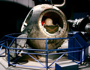 マーキュリー宇宙カプセルのお隣は、旧ソ連製の「ヴォストーク帰還用宇宙カプセル」。1961年4月12日世界初の宇宙飛行士ユーリ・ガガーリンを乗せて1時間48分にわたって宇宙を飛び、地球を1周したのち帰還した、人類史上初めての宇宙飛行に成功した宇宙船ヴォストーク1号と同型のものだよ。1979年に7日間地球を周回したのちに回収された実物だそうで、モスクワ市のスペースコマースセンターより譲渡されたんだって!カプセル表面の赤茶色に焼けている部分が大気との摩擦の凄さを感じさせます。