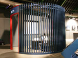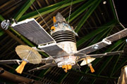 「モルニア1号通信衛星」は旧ソ連が打ち上げた通信衛星で、広大な旧ソ連を電波通信でカバーするために、地球を400kmから40000kmという大きな楕円軌道を描いて回ったの。衛星の下に付属している黄色の光学用カメラからは地上で読んでいる新聞の文字まで判読できたそうだよ。うーん、悪いことはできないねぇ(笑)。展示されているものは実物のバックアップ機。