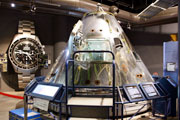 1階から2階の宇宙展示室に向かうエレベーターの中は動き出すと同時に照明が落ちて、ブラックライトを利用した宇宙パノラマが広がるの!さぁ、宇宙に向かってGo! 宇宙展示室に入り最初に目に飛び込んできたのはアメリカ初の有人飛行用宇宙船「マーキュリー宇宙カプセル」。前の画像にあるマーキュリー型レッドストーンロケットの先端に固定されて宇宙に旅立ったそうで、本物と同じ素材を使用してオリジナルを忠実に再現しているの。カプセルの内部は1人乗りで人間が乗ると身動きできないほど狭かったため、宇宙飛行士の体格は身長180cm以下、体重82kg以下に制限されていたそうだよ。