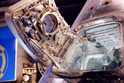 マーキュリー宇宙カプセルのお隣は、旧ソ連製の「ヴォストーク帰還用宇宙カプセル」。1961年4月12日世界初の宇宙飛行士ユーリ・ガガーリンを乗せて1時間48分にわたって宇宙を飛び、地球を1周したのち帰還した、人類史上初めての宇宙飛行に成功した宇宙船ヴォストーク1号と同型のものだよ。1979年に7日間地球を周回したのちに回収された実物だそうで、モスクワ市のスペースコマースセンターより譲渡されたんだって!カプセル表面の赤茶色に焼けている部分が大気との摩擦の凄さを感じさせます。