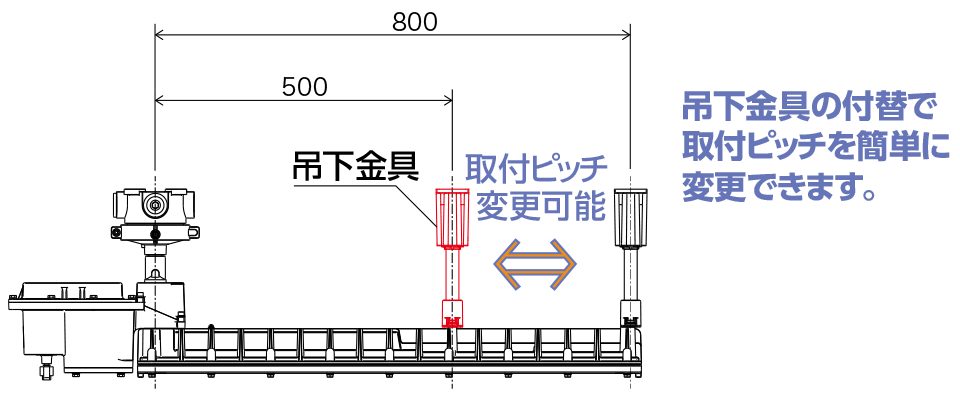 吊下金具を付替えると取付ピッチを簡単に変更できます。