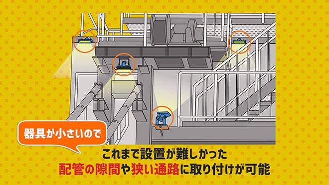 器具が小さいので、これまで設置が難しかった配管の隙間や狭い路地に取り付けが可能なんです。