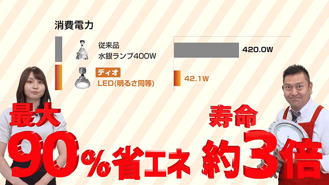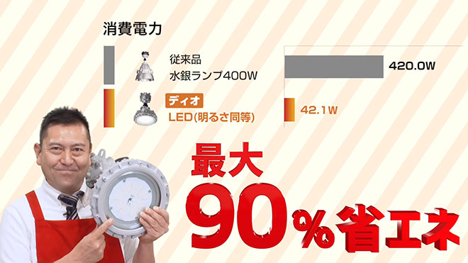 こちらも明るさは従来品と同じなのに消費電力は約90%カット!