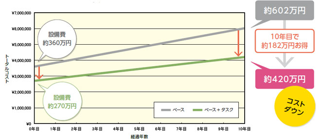 上の2つの例を比較すると、タスク照明を導入した例の方が初期コストで約90万円、10年間のトータルコストで約182万円のコストメリットが生まれます。さらに、レイアウト変更が必要な際もタスク照明の配置変更によって柔軟に対応できるなど、多くのメリットがあります。