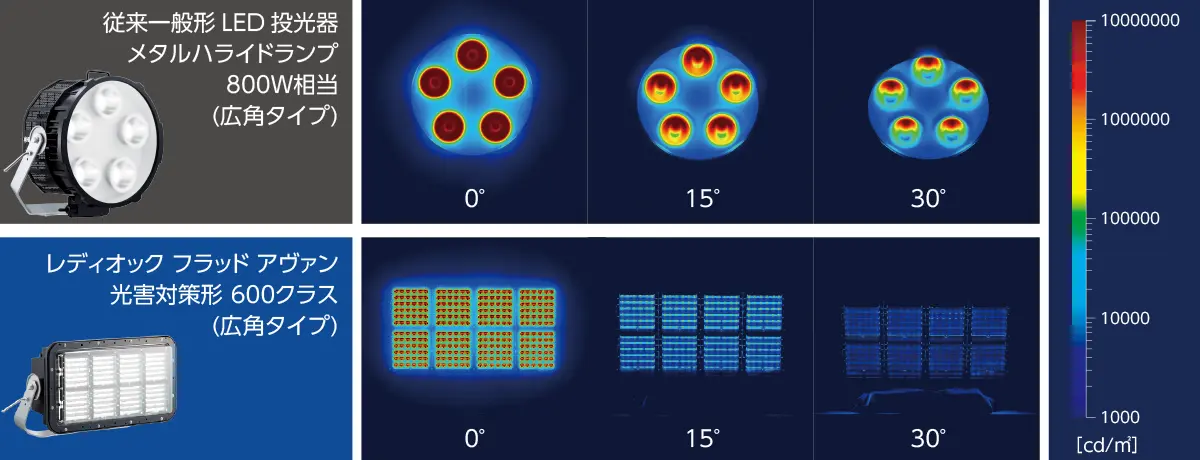 従来一般形LED投光器とレディオック フラッド アヴァン 光害対策形 600クラスの発光面輝度を比較すると、下方向に角度がつくにつれ、アヴァン 光害対策形の方が大幅に低くなり、まぶしさが抑えられています。